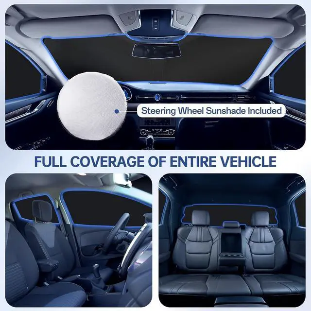 Bonus Steering Wheel Cover: FSHAANY' s car camping window covers set comes in a sleek zipper bag for easy storage. Plus, the front and rear windshield covers include a bonus bag that doubles as a steering wheel cover-keeping your hands cool and protecting your steer wheel