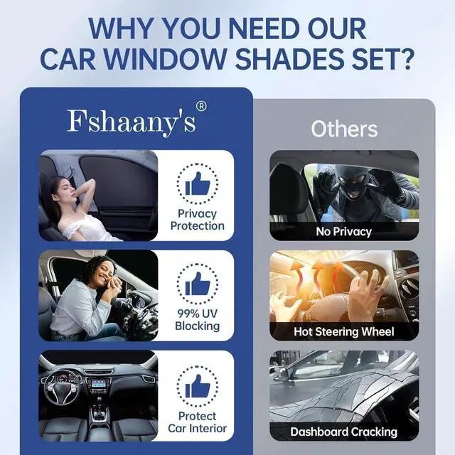 99% UV Blocking and Keep Car Cool: With 2025 upgraded reflective material, FSHAANY' S car sun shades provide excellent UV ray blocking, helping to lower your car' s interior temperature while safeguarding your dashboard, seats, and other interior features from sun damage and fading