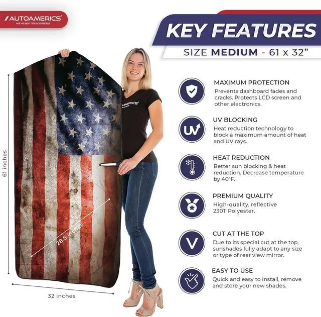 Market-leading sun protection with an eye-catching American flag design. The new Autoamerics 1 piece USA windshield sunshades combines unbeatable sun reflecting and heat blocking capabilities. We achieve our market-leading protective performance by combining the finest reflective materials and innovative design to reflect the most scorching hot UV rays and heat.