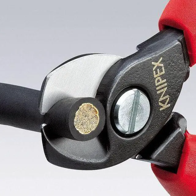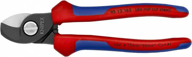 If you are looking for a shear-type cable cutter, the KNIPEX 95 12 165 SBA Cable Shear is what you need. It is designed to make clean cuts through your electrical cables. The adjustable screw joint allows you to set the cutting gap to fit the material being cut. It has a self locking feature that ensures secure blade positioning and locks in position when not in use. This 6 1/2" cable shear has a shear cut action and can be used on electrical cables. The handle design of this tool is 2-component comfort grip with double injection moulding.