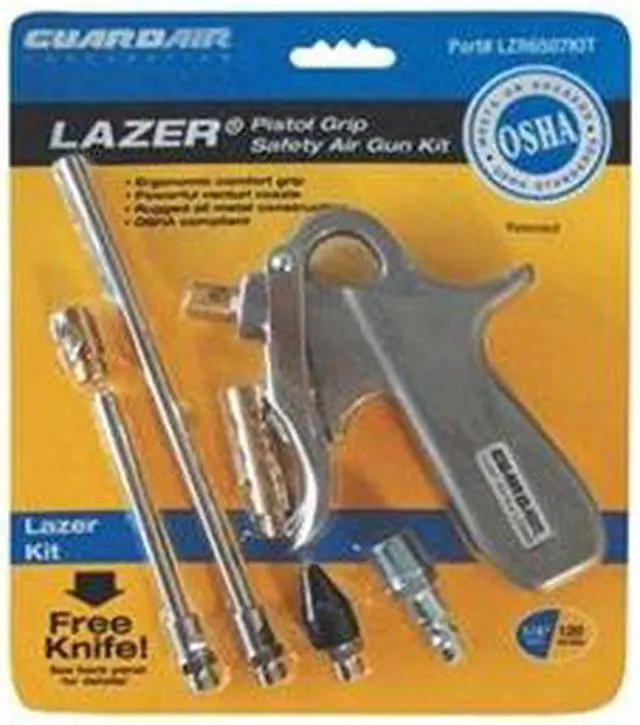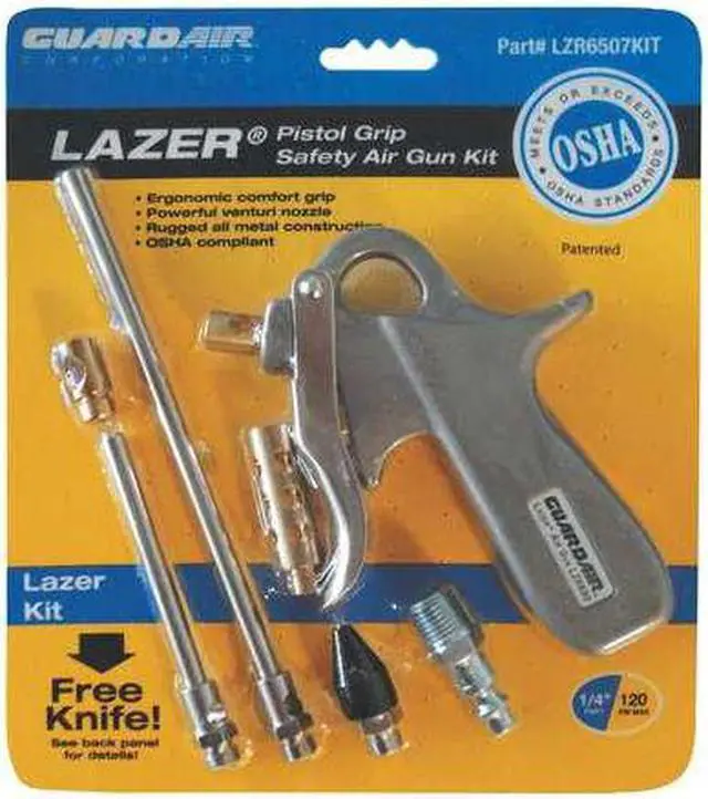 Air Gun Kit, Pistol-Grip, Number of Nozzles Included 4, Nozzle Length 1 in, 2 in, 3 in, 6 in, Nozzle Tip Material Brass, Rubber, Nozzle Angle Straight, Nozzle Features Safety Tip, Nozzle Venturi, Air Flow Pattern Focused, Sound Level 100 dB, OSHA Pressure Compliant Yes, Output Thrust 0.6 lbf, Body Material Aluminum, Air Inlet Size 1/4 in, Air Inlet Gender Female, Air Inlet Type NPT. This item has been restricted from sale in the following state (s): []