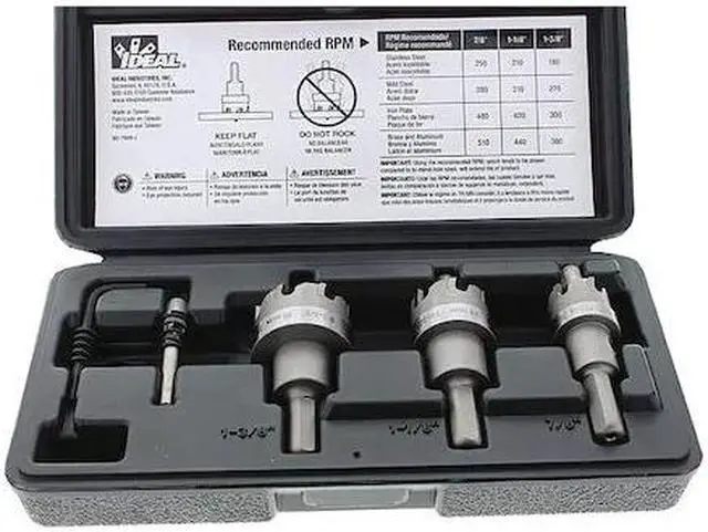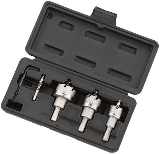 Hole Cutter Kit, Primary Material Application Metal, Materials Cut Sheet Metal, Stainless Steel, Arbor Design Built-In, Tooth Material Carbide Tipped, Number of Teeth (Hole Cutters Only) 5/6/7, Max. Cutting Depth 1/4 in, Impact Rated No, Hole Cutter Sizes (Hole Cutters) 7/8 in, 1 1/8 in, 1 3/8 in, Saw Size Range 7/8 in to 1-3/8 in, Number of Hole Cutters 3, Shank Size 3/8 in, Pilot Drill Size 3/8 in dia, Number of Pieces 4. This item has been restricted from sale in the following state (s): []