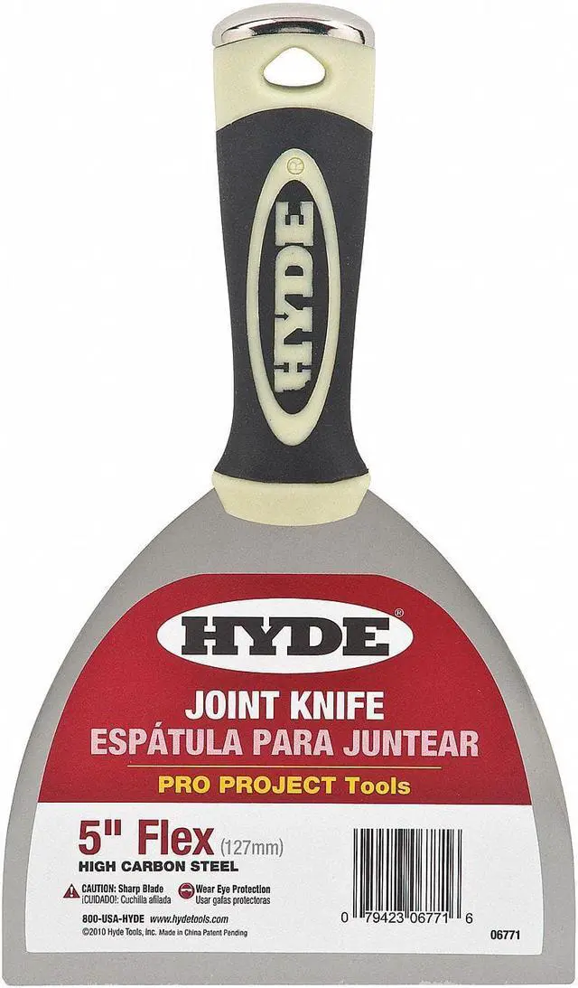 The Hyde 06771 Joint Knife is the tool you need to work with taping and compound. It has a flexible blade, which allows you to apply and smooth compound on joints with ease. The carbon steel blade is non-sparking, non-magnetic, and corrosion resistant. The black/cream color of the handle makes it easy to find when working in dark areas. With a hammer head design, this joint knife features a soft grip handle for better control. This Flexible Joint Knife from Hyde will be your go-to tool for smoothing out surfaces and applying taping compounds.