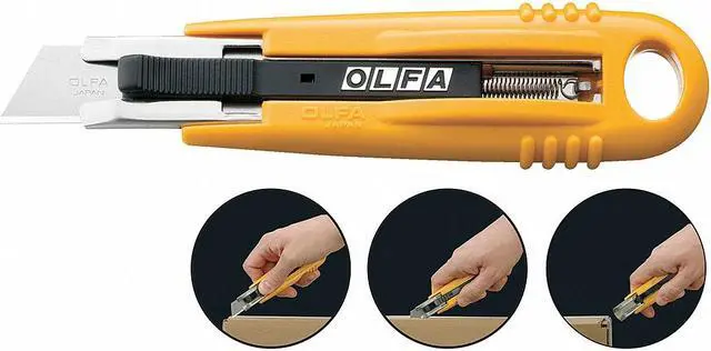 Whether you work in a warehouse or office, or even if you just need utility knives or box cutters at home, Zoro has a great selection that's priced right. Take a look at the features for Olfa Safety Knife. Application: Boxes, Corrugate, Plastic Strapping, Shrink-Wrap, Rubber, Leather, Posterboard, Blade Operation: Self-Retracting, Blade Type: Rounded Safety Blade.