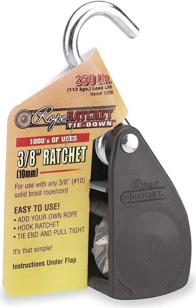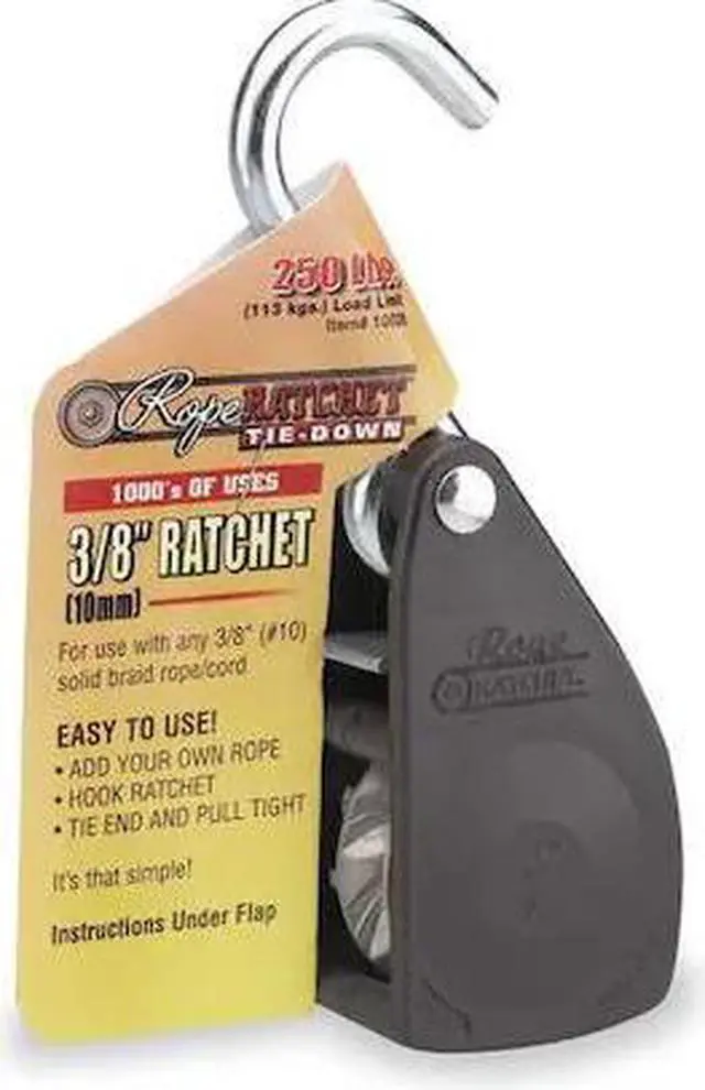 Rope Ratchet, Color Black, Compatible Rope Diameter 3/8 in, End Type S-Hook, Includes Rope Ratchet, Material Steel, Overall Length 7 in, Product Type Rope Ratchet, Working Load Limit 250 lb. This item has been restricted from sale in the following state (s): []