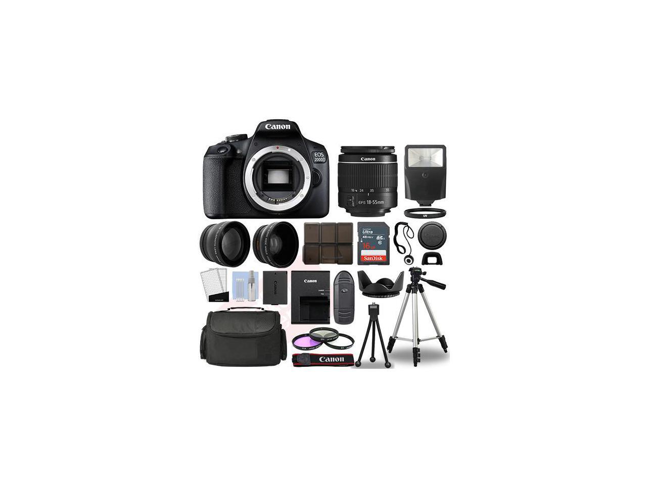 Canon EOS 2000D / Rebel T7 SLR Camera + 3 Lens Kit 18-55mm + 16GB + Flash & More