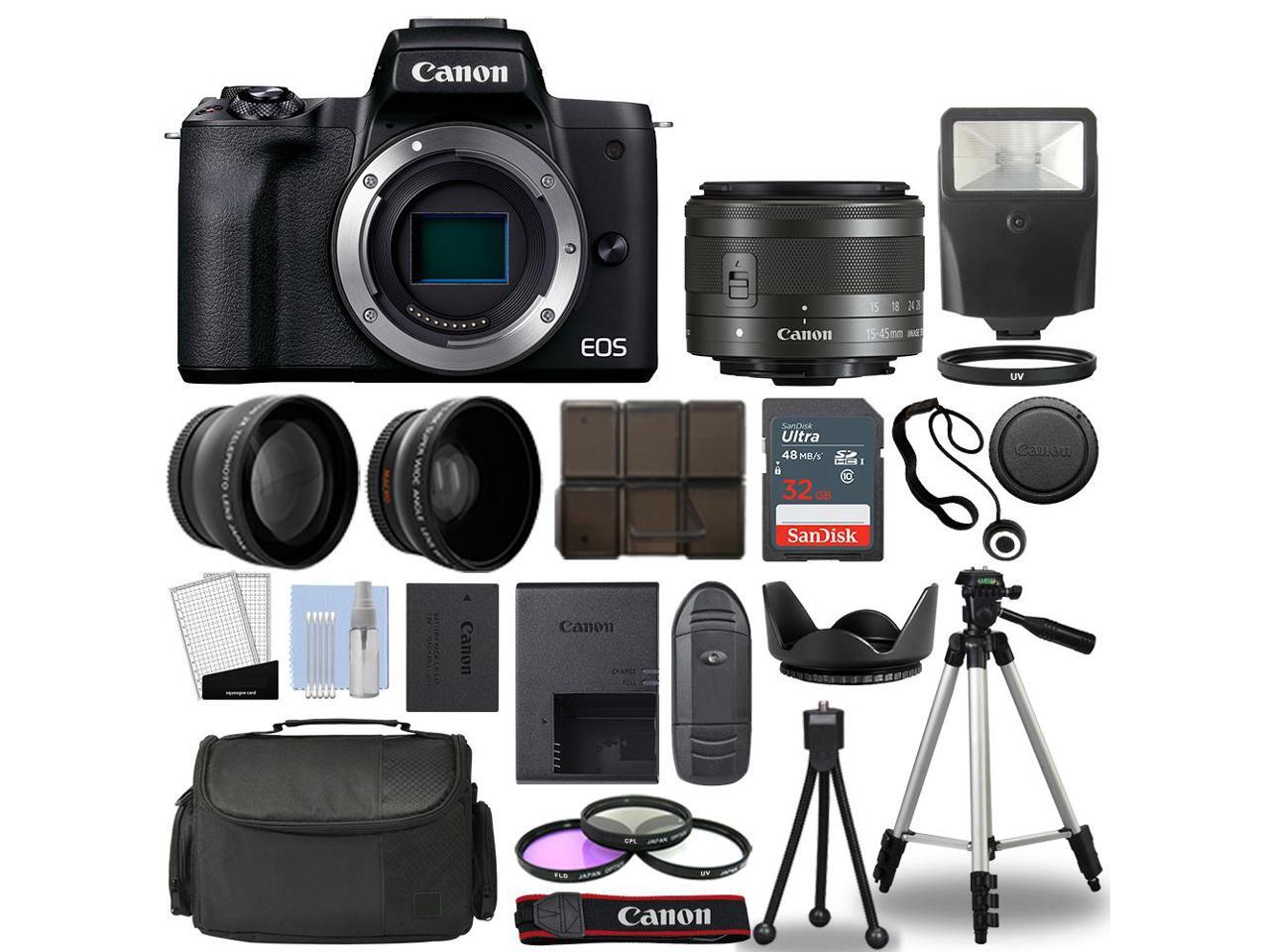 Canon EOS M50 Mark II Camera Black + 3 Lens Kit 15-45mm STM+ 32GB + Flash & More