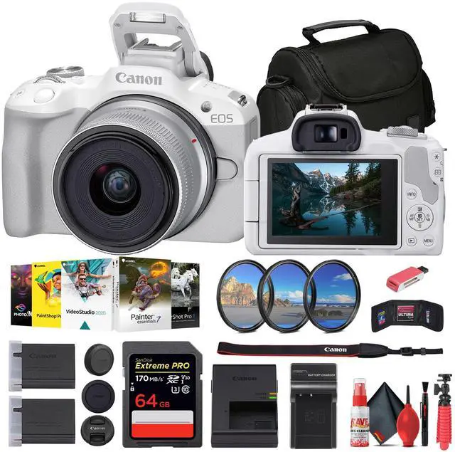Combining a sophisticated camera body with a versatile lens, the Canon EOS R50 Mirrorless Camera with 18-45mm Lens pairs the white multimedia mirrorless camera with the white RF-S 18-45mm f/ 4.5 - 6.3 IS STM standard zoom lens. Canon EOS R50 Mirrorless Camera (White) A compact and lightweight camera, the white Canon EOS R50 is a highly versatile mirrorless camera with a sophisticated photo and video feature set. Geared towards content creators and vloggers, this camera is slightly smaller and lighter than the EOS M50 Mark II and features an upgraded 24.2MP APS-C CMOS sensor and DIGIC X image processor to deliver high-resolution