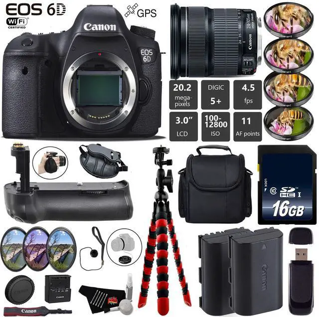 Bundle Includes: Canon EOS 6D DSLR Camera (Body Only) Canon EF 24-105mm f/ 3.5 - 5.6 IS STM Lens Professional Battery Grip Multi-Coated 3 Piece Filter Kit (UV-CPL-FLD) Extra Battery Bracket with 2 Standard Flash Hot Shoe Mounts 4PC Macro Filter Set (+1, +2, +4, +10) 16GB SDXC Class 10 Secure Digital High Speed Memory Card Deluxe Digital Camera/Video Padded Carrying Case Flexible Tripod DSLR Wrist Strap Lens Cap Keeper High-Speed Card Reader Lens Tissue Paper Cotton Swabs Lens Cleaning Solution 6Ave MicroFiber Cloth In the