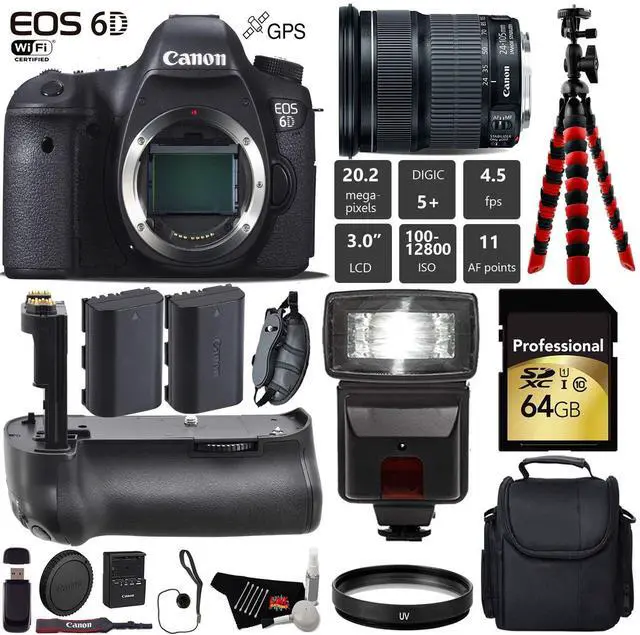 Bundle Includes: Canon EOS 6D DSLR Camera (Body Only) Canon EF 24-105mm f/ 3.5 - 5.6 IS STM Lens Professional Battery Grip UV Protection Filter Professional Flash Extra Battery 64GB SDXC Class 10 Secure Digital High Speed Memory Card Deluxe Digital Camera/Video Padded Carrying Case Flexible Tripod DSLR Wrist Strap Lens Cap Keeper High-Speed Card Reader Lens Tissue Paper Cotton Swabs Lens Cleaning Solution 6Ave MicroFiber Cloth In the