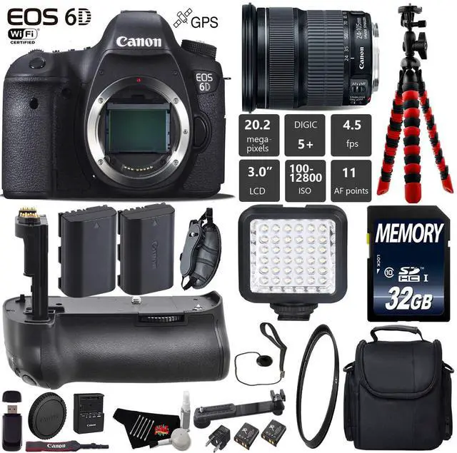 Bundle Includes: Canon EOS 6D DSLR Camera (Body Only) Canon EF 24-105mm f/ 3.5 - 5.6 IS STM Lens Professional Battery Grip UV Protection Filter Mini Portable LED Light Kit With 2 Batteries, Charger & Bracket Extra Battery 32GB SDXC Class 10 Secure Digital High Speed Memory Card Deluxe Digital Camera/Video Padded Carrying Case Flexible Tripod DSLR Wrist Strap Lens Cap Keeper High-Speed Card Reader Lens Tissue Paper Cotton Swabs Lens Cleaning Solution 6Ave MicroFiber Cloth In the
