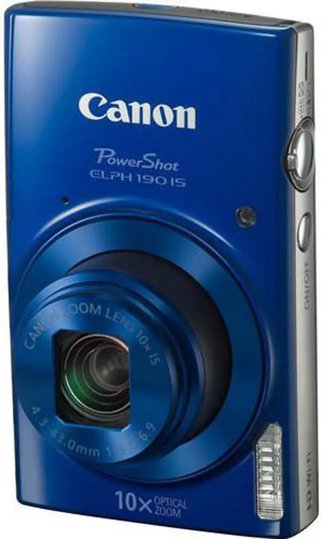 A pocketable point-and-shoot with versatile zoom lens, the blue PowerShot ELPH 190 IS Digital Camera from Canon is a sleek, convenient camera featuring a 20.0MP 1/2.3" CCD sensor and DIGIC 4+ image processor. The sensor and processor combine to afford notable image quality and sensitivity to ISO 1600, as well as the ability to record HD 720p videos at 25 fps. A 10x optical zoom lens permits working with a variety of subjects, ranging from near to far, and an Intelligent IS image stabilization system compensates for the effects of camera shake to produce sharper handheld photos. A 2.7" 230k-dot LCD monitor is available for composing your shots and reviewing imagery, and built-in Wi-Fi with NFC allows for wireless transferring of photos and movies to mobile devices. Rounding out the ELPH 190 IS' feature-set, the camera also sports a Smart AUTO mode for intelligently selecting exposure settings, Scene Modes to creatively affect the look of images, ECO Mode to save on battery life, and a dedicated Help Button for learning more about the specific camera controls.