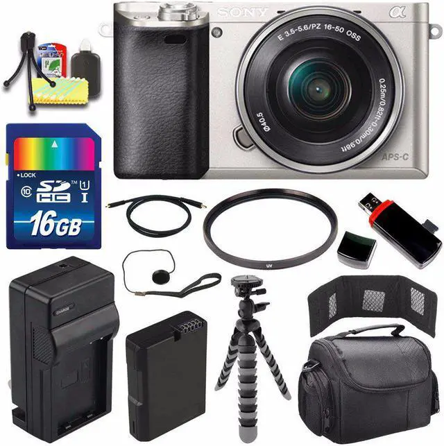 Our Kit Includes: - Sony Alpha A6000 Digital Camera w/ 16-50 Lens Silver- Extra Rechargeable Lithium Ion Replacement Battery- External Rapid Quick, Travel Charger with Car Charger Attachment- 16GB SDHC Class 10 High Speed Memory Card- Ultraviolet UV Filter - Deluxe Padded Carrying Case With Strap- 12-Inch Flexible Tripod with Gripping Rubber Legs- High Speed Gold Plated MINI HDMI Cable 6 feet- USB SDHC Memory Card Reader? - Memory Card Wallet- Lens Cap Keeper- Pack of LCD Screen Protectors + Lens/LCD Maintenance Cleaning Kit + Mini Table Top Tripod