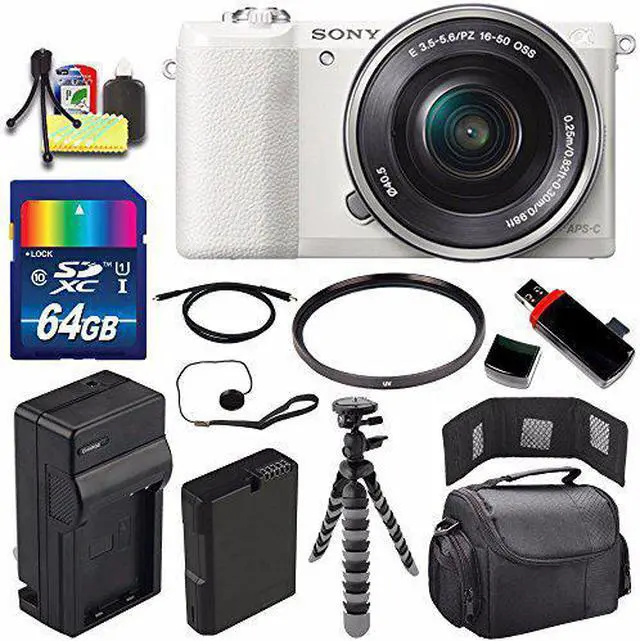 Our Kit Includes: - Sony Alpha A5100 Digital Camera w/ 16-50 Lens White- Extra Rechargeable Lithium Ion Replacement Battery- External Rapid Quick, Travel Charger with Car Charger Attachment- 64GB SDXC Class 10 High Speed Memory Card- Ultraviolet UV Filter - Deluxe Padded Carrying Case With Strap- 12-Inch Flexible Tripod with Gripping Rubber Legs- High Speed Gold Plated MINI HDMI Cable 6 feet- USB SDHC Memory Card Reader? - Memory Card Wallet- Lens Cap Keeper- Pack of LCD Screen Protectors + Lens/LCD Maintenance Cleaning Kit + Mini Table Top Tripod