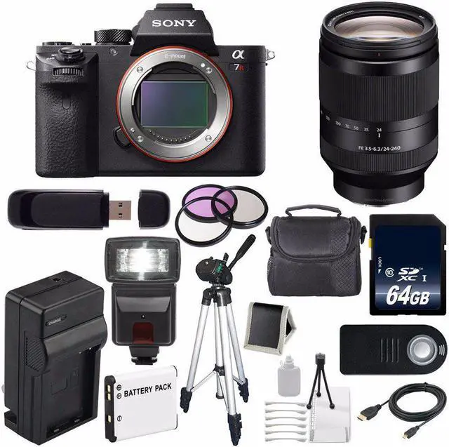 Bundle includes: 1- Sony a7R II Digital Camera (Body Only) 1- Sony FE 24-240mm f/ 3.5 - 6.3 OSS Lens1- 64GB SDXC Class 10 Secure Digital High Speed Memory Card1- Full Size Tripod W/Carry Bag (Keep it Steady! )1- 72mm 3 Piece