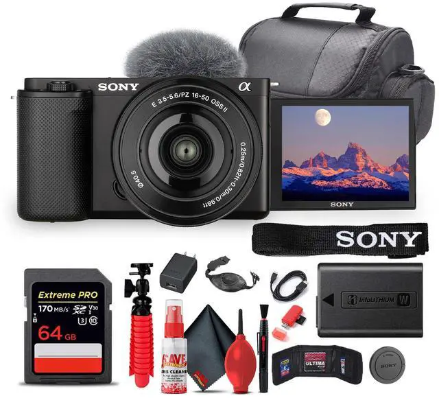 Manufacturer Included Items: Sony ZV-E10 Mirrorless Camera with 16-50mm II Lens (Black) Sony E PZ 16-50mm f/ 3.5 - 5.6 OSS II LensSony NP-FW50 Lithium-Ion Rechargeable Battery (1020mAh) Sony ALC-B1EM Body Cap for E-Mount CamerasSony AC AdapterMicro-USB CableShoulder StrapWind ScreenItems Include: 1 x Sony ZV-E10 Mirrorless Camera with 16-50mm II Lens (Black) 1 x SecureDigital 64GB Memory Card1 x Soft Bag1 x Memory Card Reader1 x Micro HDMI Cable1 x 12 inch Flexible Tripod1 x Hand Strap1 x Memory Card Wallet1 x Cleaning Kit