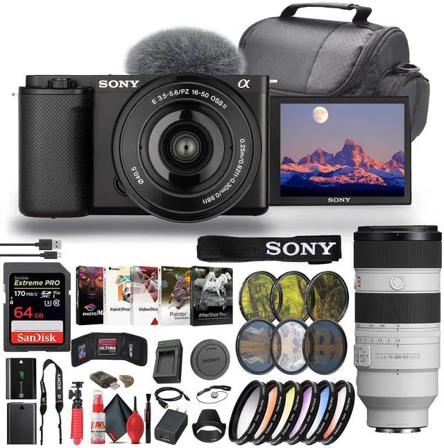 Manufacturer Included Items: Sony ZV-E10 Mirrorless Camera with 16-50mm II Lens (Black) Sony E PZ 16-50mm f/ 3.5 - 5.6 OSS II LensSony NP-FW50 Lithium-Ion Rechargeable Battery (1020mAh) Sony ALC-B1EM Body Cap for E-Mount CamerasSony AC AdapterMicro-USB CableShoulder StrapWind ScreenItems Include: 1 x Sony ZV-E10 Mirrorless Camera with 16-50mm II Lens (Black) 1 x Sony E PZ 18-105mm f/4 G OSS II Lens1 x SecureDigital 64GB Memory Card1 x 72mm Graduated Color Filter Kit1 x 40.5 mm 3 Piece Filter Kit1 x 72mm 3 Piece Filter Kit1 x Photo Software With PhotoMirage, AfterShot, Painter Essentials, PaintShop Pro, and Video Studio1 x Soft Bag2 x NPF-W50 Battery1 x NPF-W50 Charger1 x Memory Card Reader1 x Led Light1 x Micro HDMI Cable1 x 12 inch Flexible Tripod1 x Hand Strap1 x Memory Card Wallet1 x Cleaning Kit