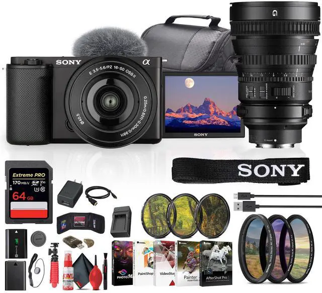 Manufacturer Included Items: Sony ZV-E10 Mirrorless Camera with 16-50mm II Lens (Black) Sony E PZ 16-50mm f/ 3.5 - 5.6 OSS II LensSony NP-FW50 Lithium-Ion Rechargeable Battery (1020mAh) Sony ALC-B1EM Body Cap for E-Mount CamerasSony AC AdapterMicro-USB CableShoulder StrapWind ScreenBundle Items Include: 1 x Sony ZV-E10 Mirrorless Camera with 16-50mm II Lens (Black) 1 x Sony E 10-18mm f/4 OSS II Lens1 x SecureDigital 64GB Memory Card1 x 40.5 mm 3 Piece Filter Kit1 x 82mm 3 Piece Filter Kit1 x Photo Software With PhotoMirage, AfterShot, Painter Essentials, PaintShop Pro, and Video Studio1 x Soft Bag1 x NPF-W50 Battery1 x NPF-W50 Charger1 x Memory Card Reader1 x Micro HDMI Cable1 x 12 inch Flexible Tripod1 x Hand Strap1 x Memory Card Wallet1 x Cleaning Kit