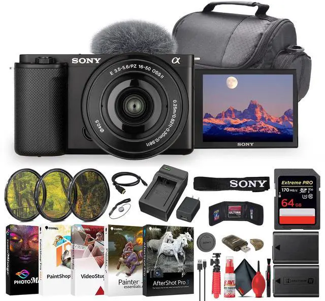 Manufacturer Included Items: Sony ZV-E10 Mirrorless Camera with 16-50mm II Lens (Black) Sony E PZ 16-50mm f/ 3.5 - 5.6 OSS II LensSony NP-FW50 Lithium-Ion Rechargeable Battery (1020mAh) Sony ALC-B1EM Body Cap for E-Mount CamerasSony AC AdapterMicro-USB CableShoulder StrapWind ScreenItems Include: 1 x Sony ZV-E10 Mirrorless Camera with 16-50mm II Lens (Black) 1 x SecureDigital 64GB Memory Card1 x 40.5 mm 3 Piece Filter Kit1 x Photo Software With PhotoMirage, AfterShot, Painter Essentials, PaintShop Pro, and Video Studio1 x Soft Bag1 x NPF-W50 Battery1 x NPF-W50 Charger1 x Memory Card Reader1 x Micro HDMI Cable1 x 12 inch Flexible Tripod1 x Hand Strap1 x Memory Card Wallet1 x Cleaning Kit