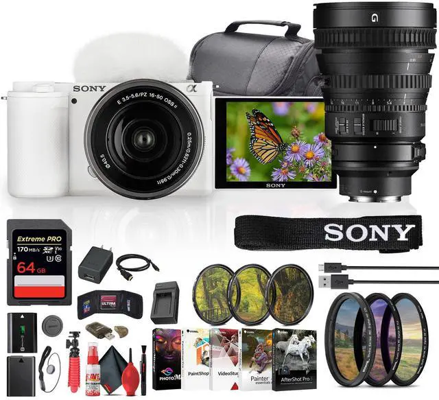 Manufacturer Included Items: Sony ZV-E10 Mirrorless Camera with 16-50mm II Lens (White) Sony E PZ 16-50mm f/ 3.5 - 5.6 OSS II LensSony NP-FW50 Lithium-Ion Rechargeable Battery (1020mAh) Sony ALC-B1EM Body Cap for E-Mount CamerasSony AC AdapterMicro-USB CableShoulder StrapWind ScreenBundle Items Include: 1 x Sony ZV-E10 Mirrorless Camera with 16-50mm II Lens (White) 1 x Sony E 10-18mm f/4 OSS II Lens1 x SecureDigital 64GB Memory Card1 x 40.5 mm 3 Piece Filter Kit1 x 82mm 3 Piece Filter Kit1 x Photo Software With PhotoMirage, AfterShot, Painter Essentials, PaintShop Pro, and Video Studio1 x Soft Bag1 x NPF-W50 Battery1 x NPF-W50 Charger1 x Memory Card Reader1 x Micro HDMI Cable1 x 12 inch Flexible Tripod1 x Hand Strap1 x Memory Card Wallet1 x Cleaning Kit
