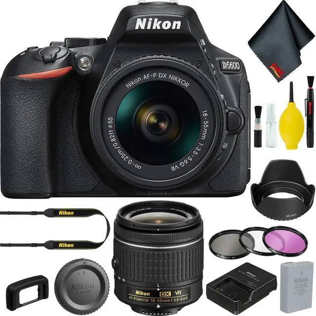 Bundle Items Include: Nikon D5600 DSLR Camera with 18-55mm LensEN-EL14A Rechargeable Li-Ion Battery for Select Nikon CamerasMH-24 Quick ChargerDK-25 Rubber EyecupAN-DC3 Camera Strap (Black) BF-1B Body Cap55mm 3 Piece