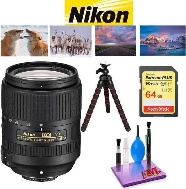 Manufacturer Included Items: Nikon AF-S DX NIKKOR 18-300mm f/ 3.5 - 6.3G ED VR Lens67mm Snap-On Lens CapLF-4 Rear Lens CapBundle Items Include: 1 x NIKON 18-300MM F/ 3.5 - 6.3G ED AF-S DX VR LENS 1 x Sandisk 64GB EXTREME SDXCUHS-I 90/60MB/S1 x Backpack with Padded Compartments for Cameras1 x Tabletop Tripod1 x Table Top Tripod, Lens Cleaning Kit, LCD Protector1 x High Quality Dust Blower1 x Lens Pen Cleaner