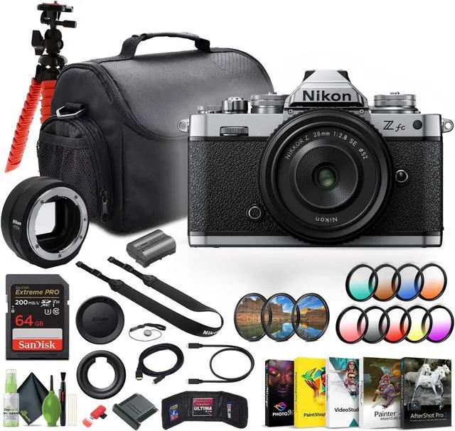 - Bundle Items Include: - Nikon Z fc Mirrorless Digital Camera with 28mm Lens (BLACK) - Nikon FTZ II Mount Adapter - Vivitar 52mm Graduated Color Filter Kit - Corel Photo, Video, & Art Suite Deluxe - Camera Bag - Extreme PRO 64GB Memory Card - Cleaning Kit - Micro HDMI Cable - Lens Cap Keeper - 12 inch Flexible Tripod - Memory Card Wallet - USB Card Reader, SD/microSD - 3PC MC Pro Filter Kit UV/CPL/F 52BL