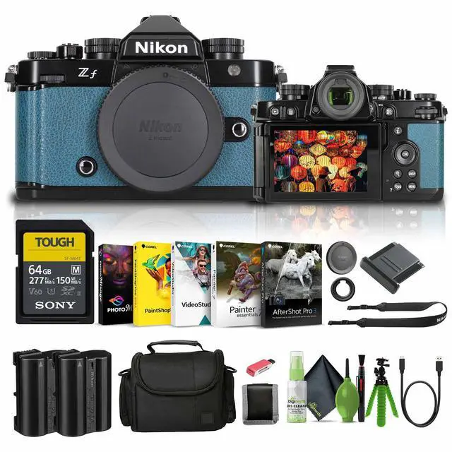 The Nikon Zf Mirrorless Camera (Blue) combines vintage charm with cutting-edge technology, offering an immersive experience with its retro-styled controls and innovative features. Crafted from precision-carved aluminum, it boasts knurled dials and a prism-shaped housing for the electronic viewfinder, ensuring intuitive operation and focus manipulation. Dual memory card slots and a weather-resistant magnesium alloy chassis enhance versatility and durability. Powered by a 24.5MP FX-Format BSI CMOS Sensor and EXPEED 7 Image Processor, it delivers exceptional image quality, low-light performance, and high-speed processing. With features like 96MP high-resolution photo mode and advanced autofocus capabilities, including eye-detection AF for photo and video, it ensures precise results in any scenario.