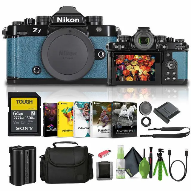 The Nikon Zf Mirrorless Camera (Blue) combines vintage charm with cutting-edge technology, offering an immersive experience with its retro-styled controls and innovative features. Crafted from precision-carved aluminum, it boasts knurled dials and a prism-shaped housing for the electronic viewfinder, ensuring intuitive operation and focus manipulation. Dual memory card slots and a weather-resistant magnesium alloy chassis enhance versatility and durability. Powered by a 24.5MP FX-Format BSI CMOS Sensor and EXPEED 7 Image Processor, it delivers exceptional image quality, low-light performance, and high-speed processing. With features like 96MP high-resolution photo mode and advanced autofocus capabilities, including eye-detection AF for photo and video, it ensures precise results in any scenario. Its UHD 4K recording capabilities and 5-axis in-body vibration reduction system offer filmmakers and photographers the tools they need to capture cinematic footage and sharp, shake-free images. Whether you're a professional or an enthusiast, the Nikon Zf empowers you to unleash your creativity and capture timeless imagery with style and precision.
