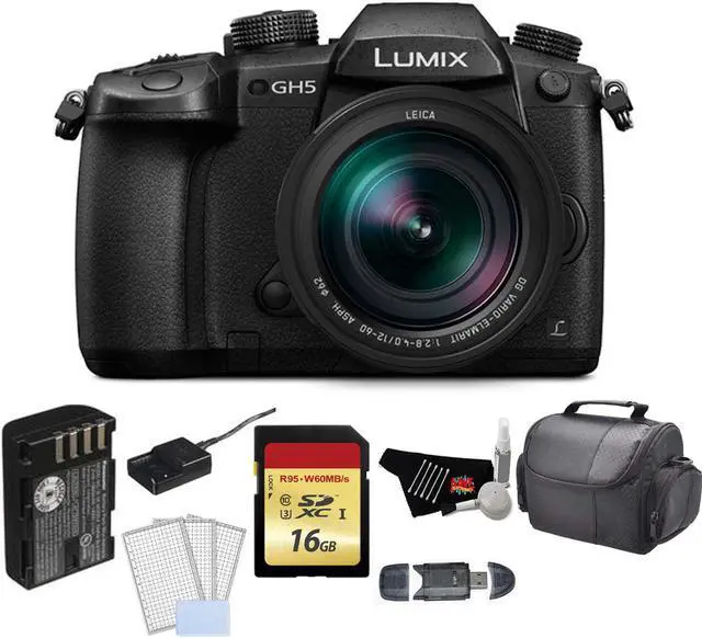 4:2: 2 internal recording with select settings, Full HD video at up to 180 fps, 12 fps continuous shooting, and sensitivities up to ISO 25600. Also, the camera features built-in 5-axis sensor stabilization, which can work with certain lenses to activate Dual I. S. 2 for highly effective shake correction that can compensate for up to 5 stops of shutter speed. Other improvements include a speedier and more accurate Advanced DFD autofocus system that can lock on in just 0.05 seconds, as well as 6K PHOTO at 30 fps and 4K PHOTO at up to 60 fps. Manufacturer Included Items Panasonic Lumix DC-GH5 Mirrorless Micro Four Thirds Digital Camera with 12-60mm Lens Leica DG Vario-Elmarit 12-60mm f/ 2.8 -4 ASPH. POWER O. I. S. Lens DMW-BLF19 Rechargeable Lithium-Ion Battery Pack ( 7.2V, 1860mAh) DMW-BTC10 Battery Charger Body Cap USB Cable Shoulder Strap Cable Holder Bundle Items 16GB Memory Card LCD Screen Protectors Cleaning Kit Carrying Case SD Card USB Reader