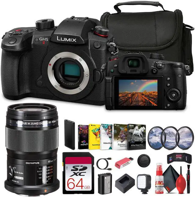 4:2: 2 at 30p, offering unparalleled detail and color accuracy. The preinstalled V-Log L simplifies color grading, aligning perfectly with VariCam-series cameras for seamless multi-camera setups. Enhanced 5-axis Dual I. S. 2 stabilization compensates for 6.5 stops of camera shake, delivering sharp, clear shots even in challenging conditions. With its 3'' 1.84 m-dot rear TFT LCD and high-resolution OLED Live View Finder, the GH5 II ensures flexible framing and easy navigation. The 225-area Depth-from-Defocus autofocus system, powered by deep learning technology, excels in tracking fast-moving subjects, making it ideal for wildlife and action photography. Built for durability, its magnesium alloy body is splash, dust, and freezeproof. Whether for live streaming via the Lumix Sync app or high-speed 6K PHOTO mode, the Panasonic Lumix GH5 II is the ultimate tool for today's creators.