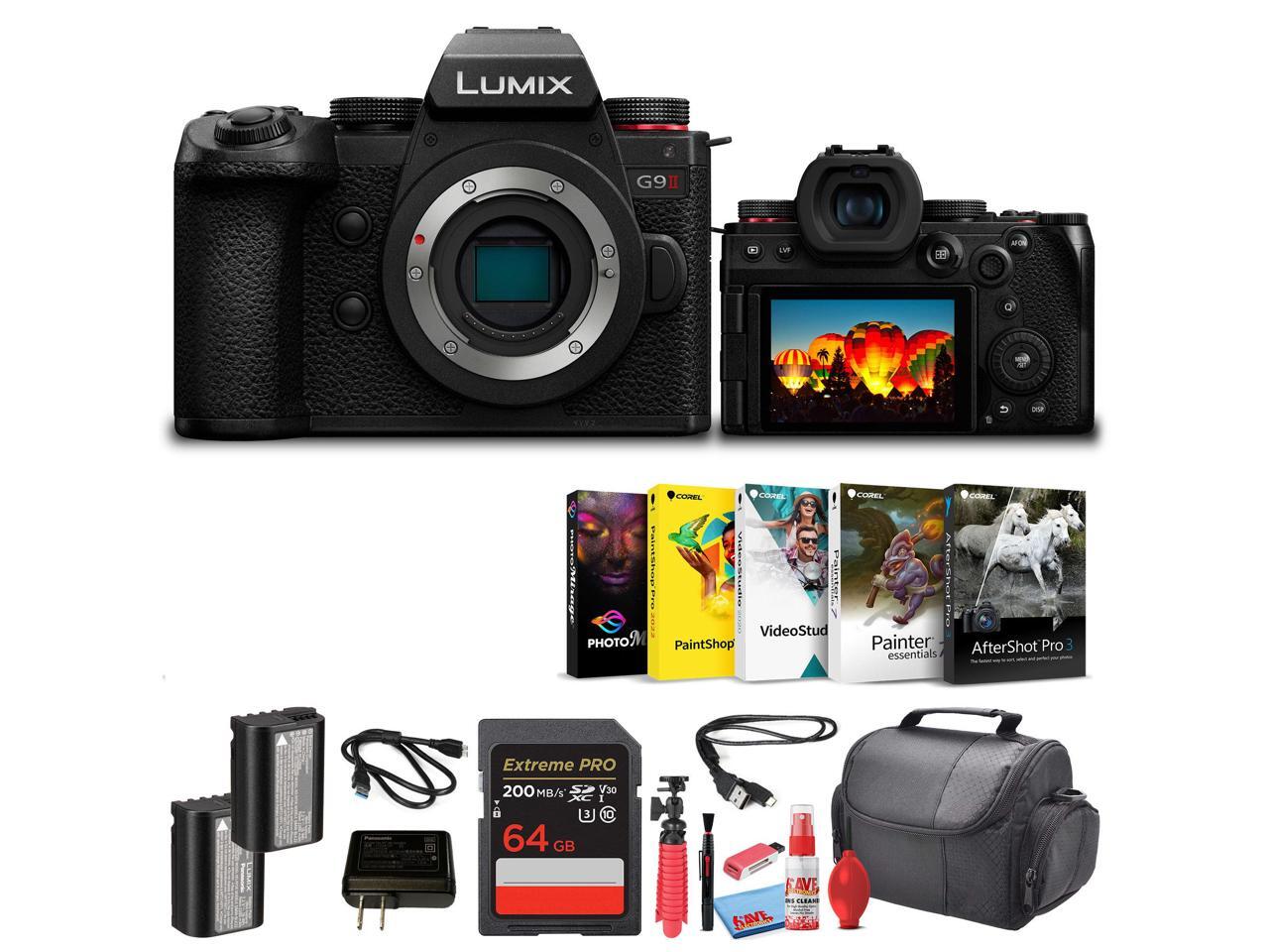 Bundle Items Include:1 x Panasonic Lumix G9 II Micro Four Thirds Mirrorless Camera, 25.2MP (Body Only), 1 x 64GB Extreme Pro Card, 1 x DMW-BLK22 Lithium-Ion Replacement, 1 x Photo Software, 1 x Memory Card Reader, 1 x Deluxe Soft Case, 1 x 12_inch Flexible Tripod, 1 x Cleaning Kit. Powerful Sensor and Enhanced Autofocus: Capture every detail with the Lumix G9 IIs 25.2MP Live MOS Micro Four Thirds sensor and next-gen processing engine. Enjoy lifelike tonal gradations, vibrant colors, and cinematic 4K video. With Phase Hybrid Autofocus and AI subject recognition, tracking is faster and smarterdetecting cars, motorcycles, and even animal eyes for ultra-precise focus in both photography and video recording.. High-Speed Shooting Capabilities: Never miss a moment with the Lumix G9 IIs ultra-fast 75 fps burst shooting and pre-burst mode that captures images up to 1.5 seconds before you press the shutter. Ideal for fast-paced scenes, this powerful feature allows photographers and content