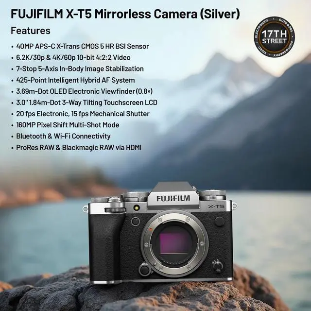 The FUJIFILM X-T5 Mirrorless Camera in silver delivers outstanding image quality with a 40MP APS-C X-Trans CMOS 5 HR BSI sensor and the powerful X-Processor 5. It records up to 6.2K30 10-bit 4:2:2 video, supports 160MP Pixel Shift Multi-Shot, and offers 7-stop in-body image stabilization for sharp handheld shots. The tilting touchscreen LCD and advanced 425-point hybrid AF system make it a versatile tool for both photography and video. Its compact, lightweight body retains classic dial-based controls, while the high-resolution 3.69m-dot OLED EVF ensures precise composition. Designed for creators, it combines professional performance with portability for everyday shooting and travel.