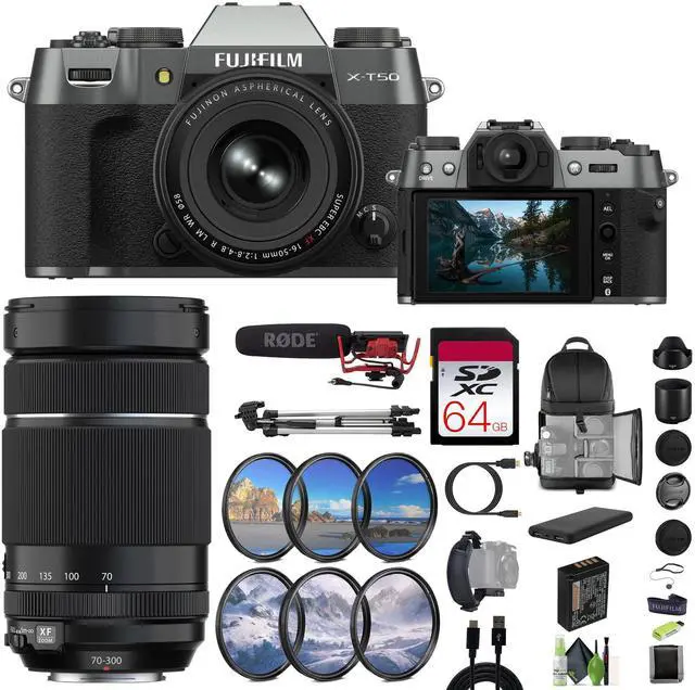 Unveil the Charcoal Silver X-T50 Mirrorless Camera, a fusion of cutting-edge technology and timeless craftsmanship, poised to revolutionize your photography experience. With a dedicated film simulation dial, this camera beckons you into the captivating world of FUJIFILM's iconic film replications, including the latest REALA ACE, while boasting flagship features reminiscent of the acclaimed X100VI. Armed with a 40.2 -megapixel X-Trans CMOS 5 HR sensor and X-Processor 5 combination, it offers unparalleled image quality and versatility, enhanced further by the freedom to interchange lenses. Paired with the XF 16-50mm f/ 2.8 - 4.8 R LM WR Lens, this kit opens doors to limitless creativity, boasting a broad zoom range, compact design, and advanced optical features for unparalleled performance.