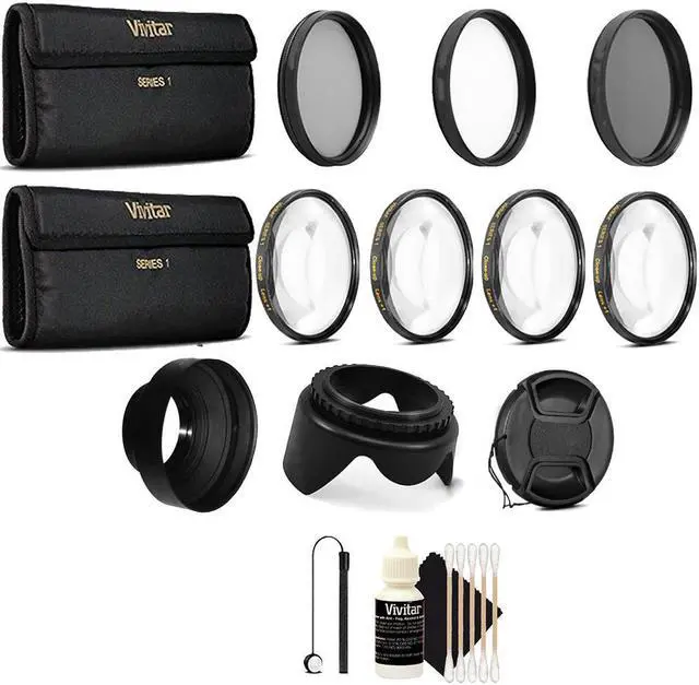 The digital macro filter kit includes four close-up diopters of +1, +2, +4 and +10 magnification with a 52mm thread for easy screw-on attachment, effectively transforming your lens into a crisp macro lens. You can combine diopters to multiply magnification effect and add other filters for additional effects. This 52mm Digital Filter Kit includes an ND4 filter, a circular polarizer filter, and a UV filter. This 52mm Pro Series Hard Tulip Shaped Lens Hood prevents image-degrading lens flare by blocking stray light from striking the surface of the lens. It also assists in keeping moisture or wind blown debris off the lens.