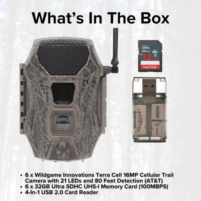 • Bundle Includes: Wildgame Innovations Terra Cell 16MP Cellular Trail Camera, 32GB Ultra SDHC UHS-I Memory Card, and USB Card Reader
