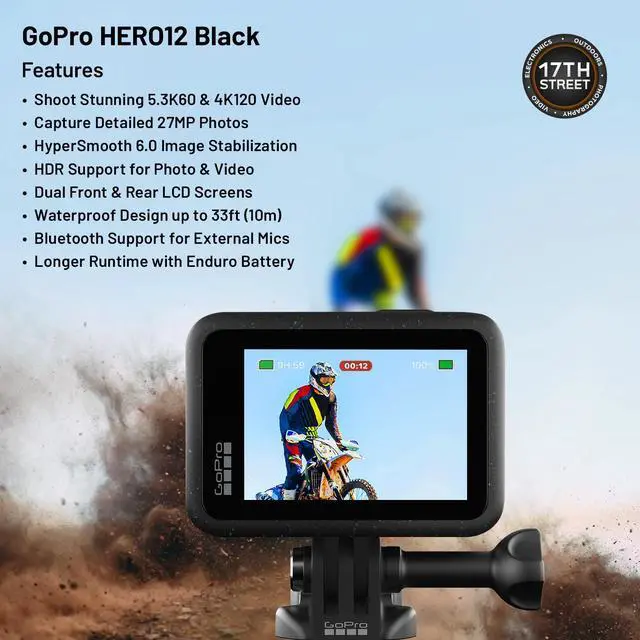 Experience pro-level imaging with the GoPro HERO12 Blackengineered for ultimate adventure content. Capture stunning 5.3K 60 or 4K120 video and 27MP high-res photos with HDR support. HyperSmooth 6.0 stabilization ensures ultra-smooth footage even in intense motion. Dual LCD screens offer flexible framing, while Bluetooth audio lets you connect wireless mics or earbuds for crystal-clear sound.