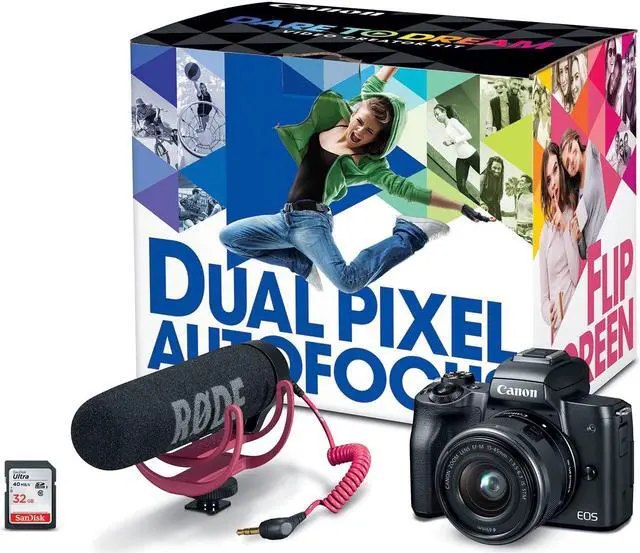 Canon believes in your passion, creativity and art. Your voice and vision, seen and heard however you want. The Video Creator Kit gives you the tools to make your dreams into reality. The EOS M50 is a compact interchangeable lens camera for aspiring photographers looking for an easy way to boost the quality of their photos and videos. With clear, high-resolution 4K UHD 24p video, you can capture the incredible details and cinematic moments of your life at home or wherever your adventures take you. Snap vibrant, eye-catching photos with a 24.1 Megapixel (APS-C) CMOS Sensor using the built-in Electronic Viewfinder or Vari-angle Touchscreen LCD.