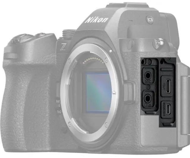 - The headphone jack doubles as a terminal for Nikon's optional MC-DC3 Remote Release Cord, and the USB-C terminal provides both camera charging and USB power delivery. A micro-HDMI port allows for external recording and live view.