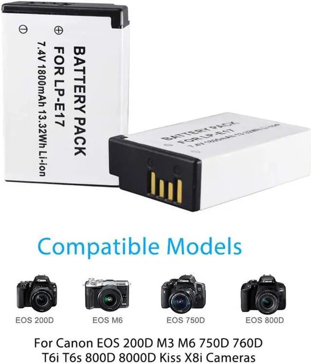 With precision decoding circuit board, our replacement Canon LP-E17 batteries are fully decoded only in Canon EOS Rebel T6i, Rebel T6s, Rebel T7i, 750D, 760D, 8000D, Kiss X8i, 800D, 77D, 200D, EOS SL2 Camera.