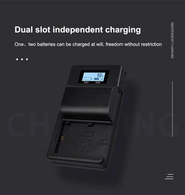 It can charge 2*NP-FW50 batteries simultaneously from any USB power source. When Charger is powered on, LCD displays tell you the charging level