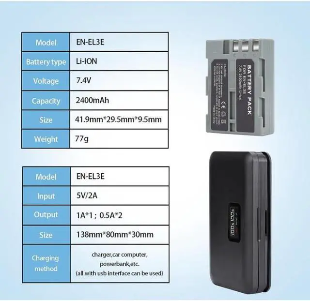 Fast Charging/High Capacity: Charge batteries quickly and easily with the camera battery charger. It can charge one or two el3e batteries akku at once and has an input of DC 5V / 2A (Max) and an output of DC 7.4V /800mA (x1) DC 8.4V /600mA (x2). 2 en-el3a batteries with a capacity of 2400mAh give you more power for video recording and up to 350 photos to keep your camera running and record the good life.