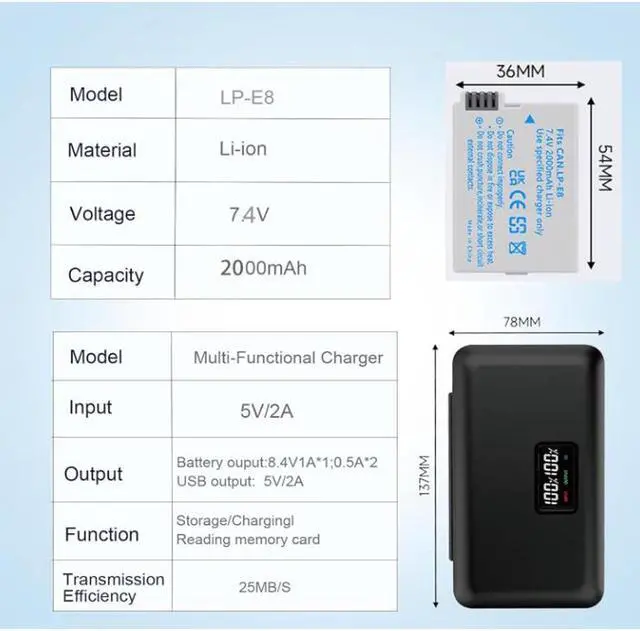 Three Charging Way: The LPE8 lcd battery charger built with a Double-Sided Plug USB Cable ( 34.5 cm length) and Type-C port Input power up your camera's batteries, with a good-charging efficiency, only 2 hours to fully charge a battery. USB port output could as a power bank to charge your phones in an emergency