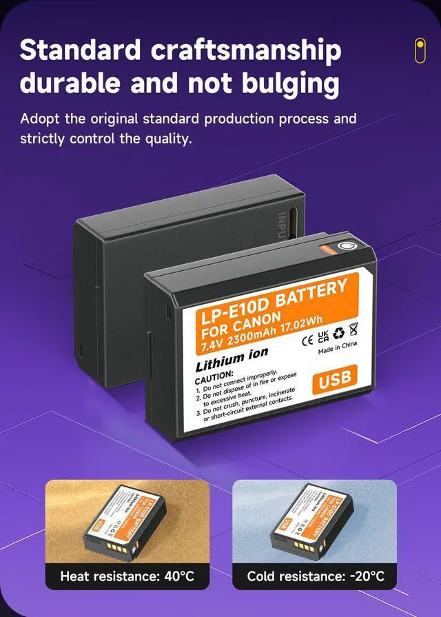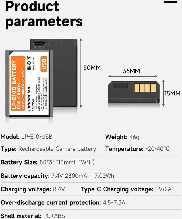 USB-C Fast Charging: This LP-E10 battery has a USB Type-C charging port that reduces charging time by 40% compared to other USB-C camera batteries, and reduces charging time by 65% compared to conventional charging. With high current charging (5V/2A), you can have a full battery round 3 hours. And it comes with a charging indicator to clearly show the charging progress. Red indicator for charging, green indicator for fully charged.