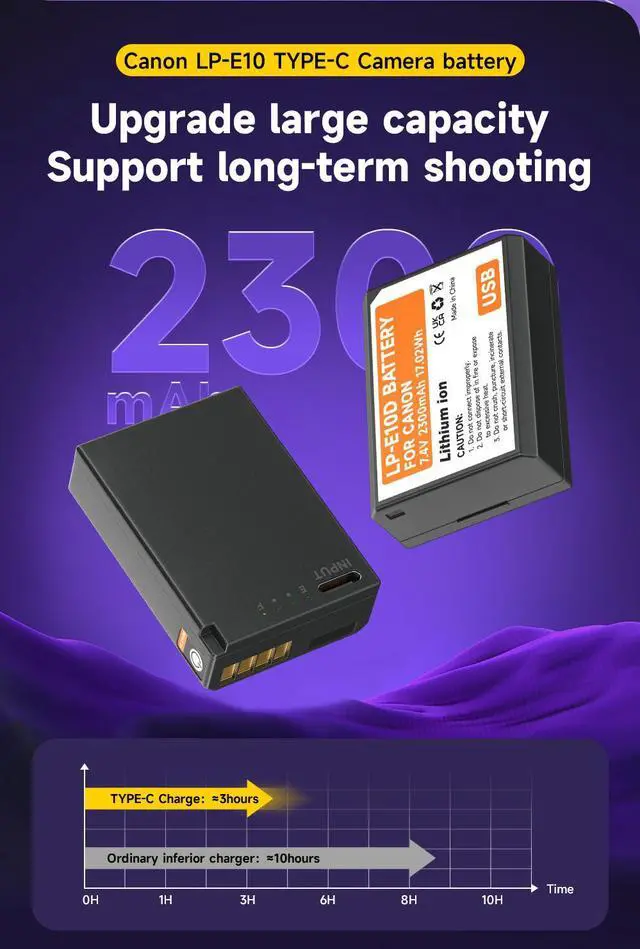 LP-E10 Battery Replacement: LPE10 with 2300mAh high capacity replacement battery.