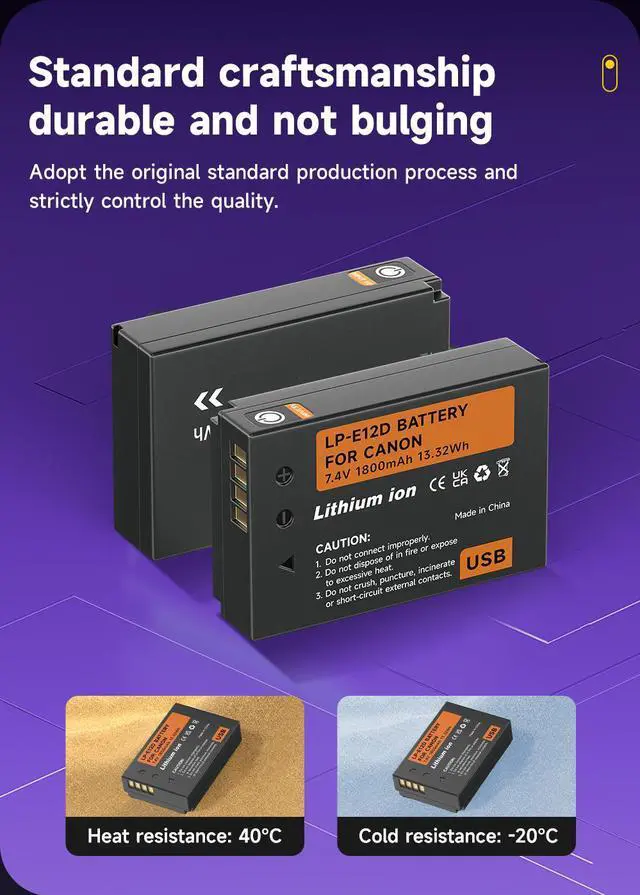 USB-C Fast Charging: This LP-E12 battery has a USB Type-C charging port that reduces charging time by 40% compared to other USB-C camera batteries, and reduces charging time by 65% compared to conventional charging. With high current charging (5V/2A), you can have a full battery round 3 hours. And it comes with a charging indicator to clearly show the charging progress. Red indicator for charging, green indicator for fully charged.