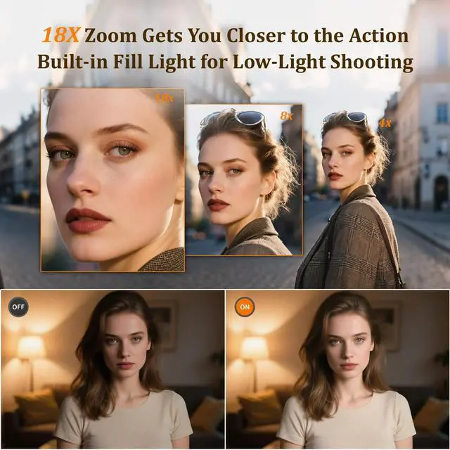 Multifunctional Modes: Offers various shooting modes like continuous shooting, slow action, delayed shooting, and beauty photography, plus a fill light for low-light conditions.