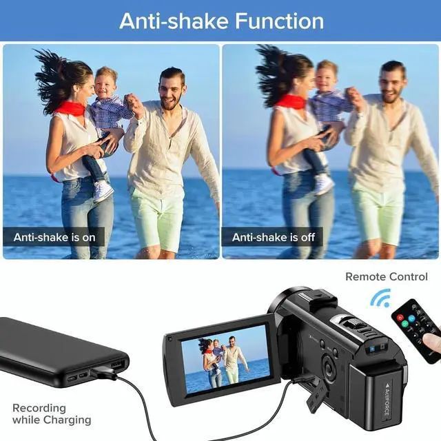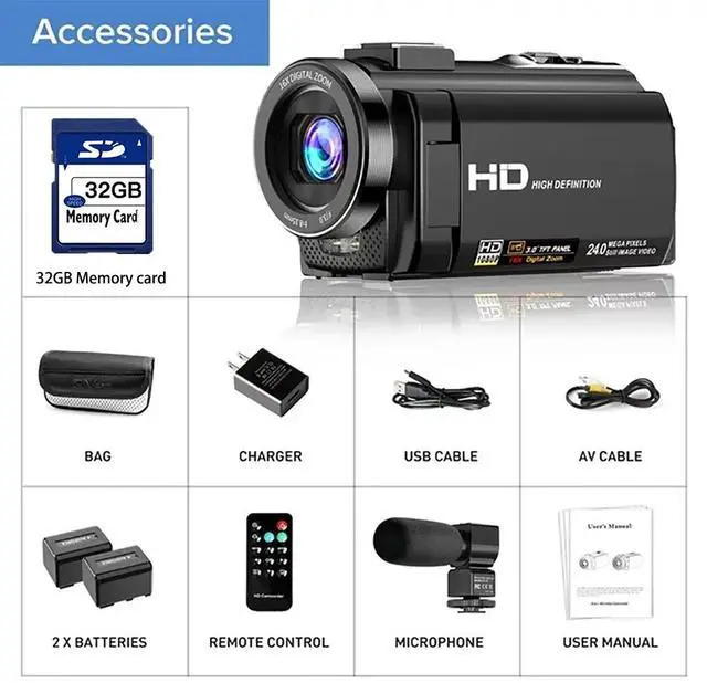 • Included Accessories: Package contains the camcorder, a 32GB SD card, two batteries, remote control, USB cable, charger, and a DV bag.