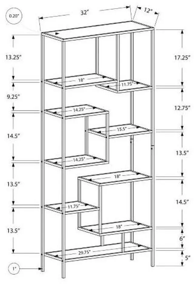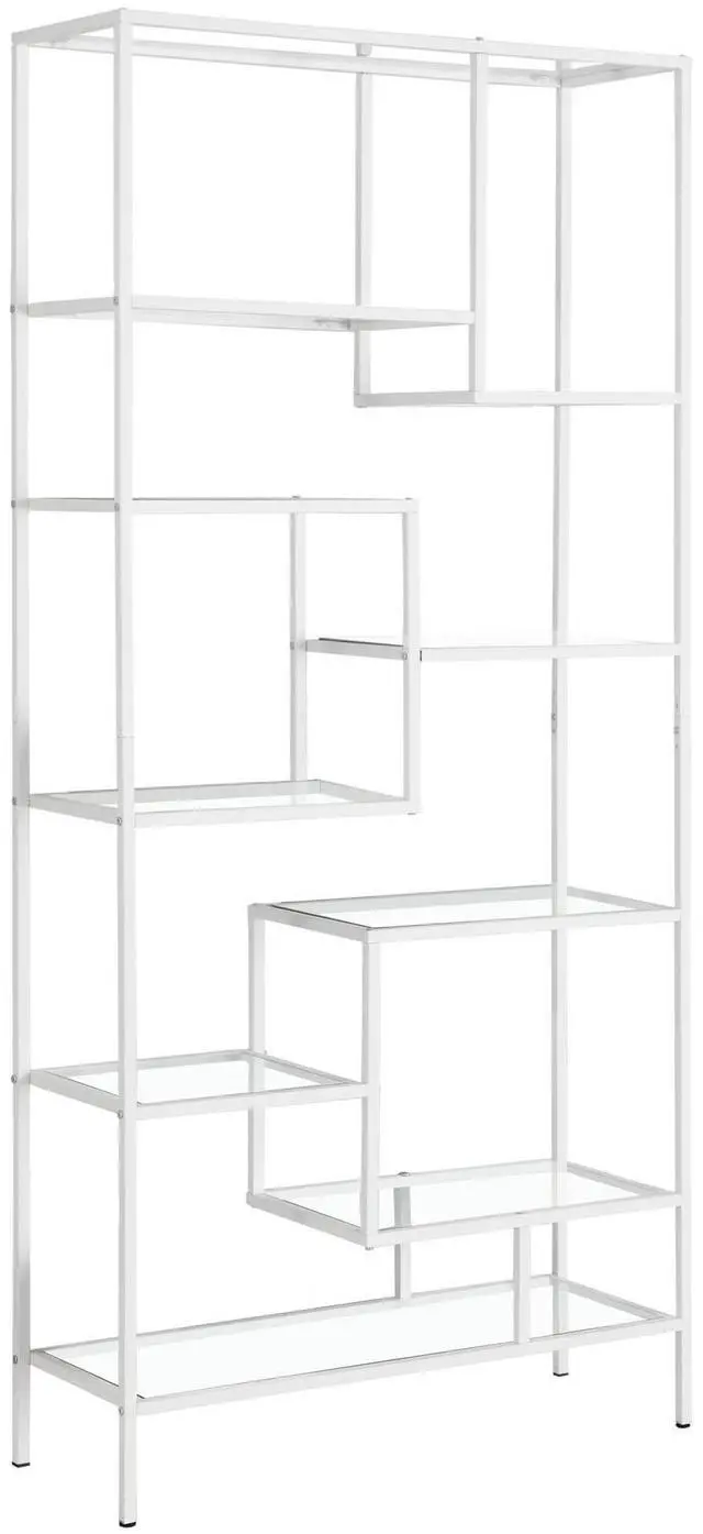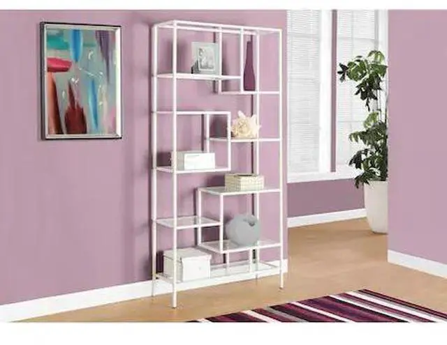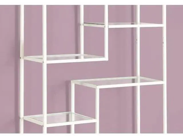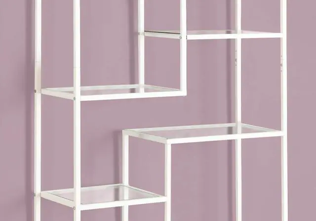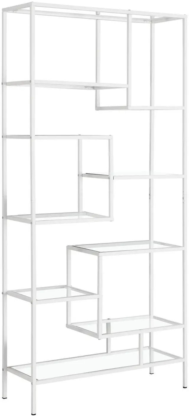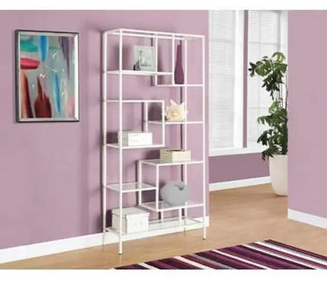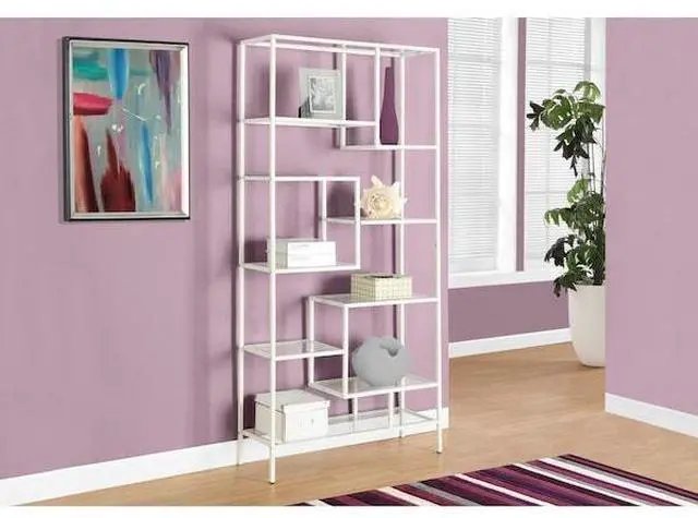 Open back. Modern metal frame. Clear tempered glass shelves. Nine asymmetrical shelves in various size. Easily blends with any decor. Assembly required. 32 in. W x 12 in. D x 72 in. H (32 lbs.). Assembly Instructions. Give your home a bold, modern look with this unique bookcase. Perfect for displaying your favorite books, frames or other decorative items. This stylish unit will be a great addition to your home office, living room, bedroom or even hallway to keep you organized in style.