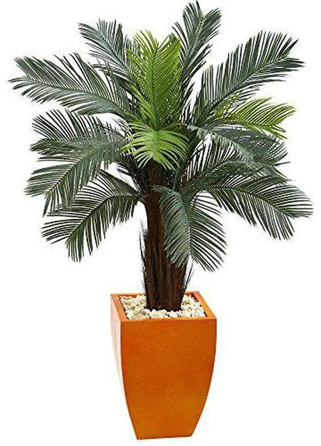 Elegant green fronds explode out in a canopy of tropical elegance held up by a highly detailed natural trunk. The lifelike artificial cycas tree has been crafted with care and paired with a retro-cool orange vase topped with natural rocks. Place this faux cycas tree on a table or a colorful trivet for a dramatic look. UV resistant so great for indoor or outdoor use.